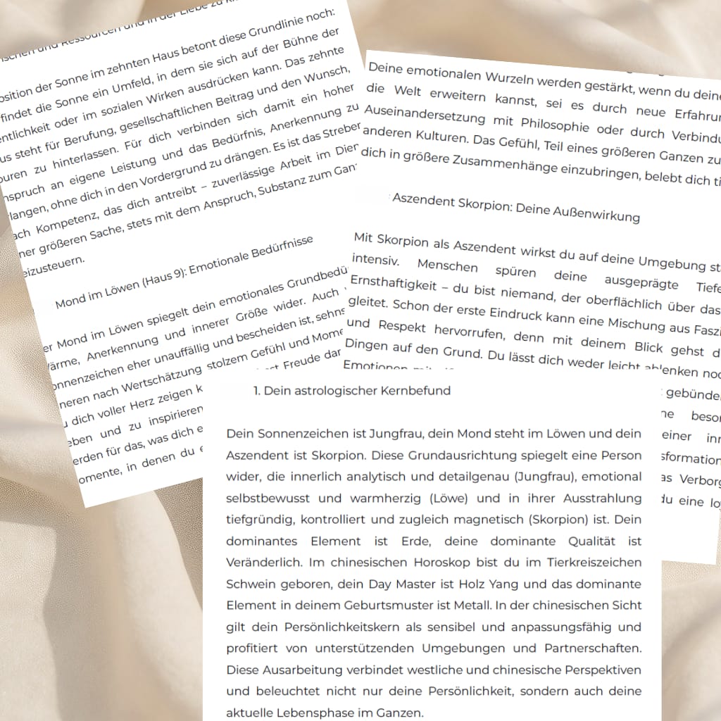 Du sollst dich beim Lesen wiedererkennen. Nicht in einer Schablone, nicht in einem Sternzeichen-Text, der für Millionen Menschen passt – sondern in einem Bild, das tatsächlich für dich gezeichnet wurde. Dafür nehmen wir uns die Zeit, die jede Auswertung braucht.